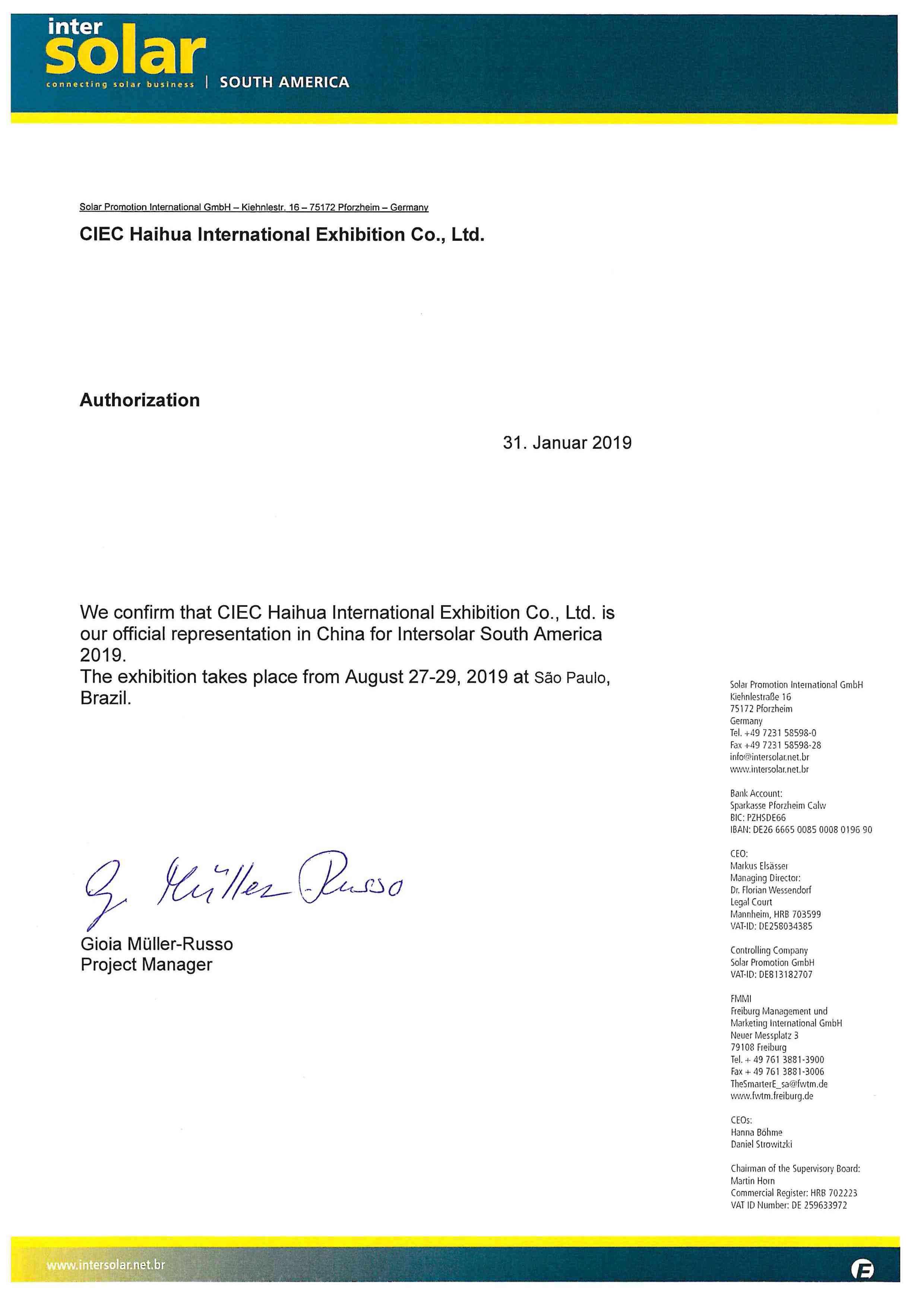 自2008年起,INTERSOLAR/EES的中國公司參展事宜由該展中國總代理-北京中展海華國際展覽有限公司(原京慕國際展覽有限公司)負(fù)責(zé)該展的推廣、宣傳和組織工作,為中國企業(yè)簽發(fā)邀請函、提供展會咨詢、參展及參觀的各項(xiàng)服務(wù)。